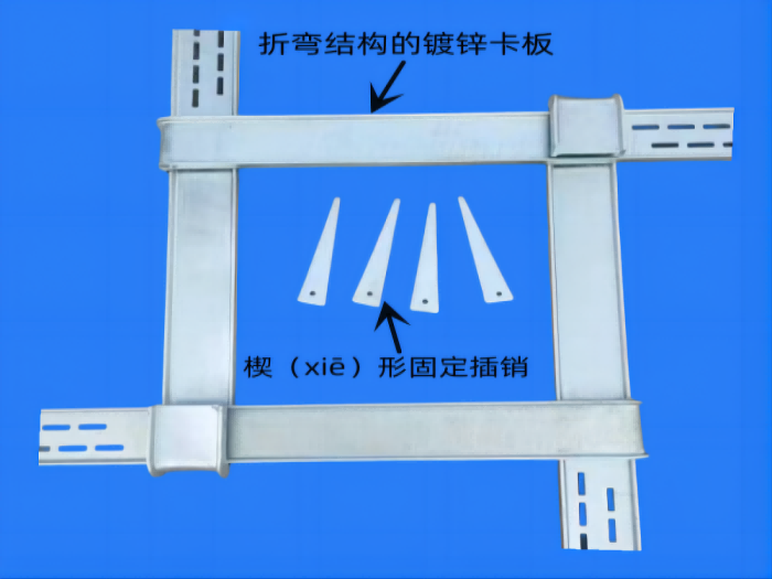 方柱扣由4個(gè)一端為折彎結(jié)構(gòu)的鍍鋅卡板+4個(gè)楔(xiē)形固定插銷組成;且每條卡板上沿其長度方向設(shè)置有若干個(gè)間隔相同的固定孔,固定銷穿過固定孔和面孔將卡板與限位套固定,從而形成安裝拆卸方便的加固模板(如下圖)。
