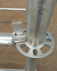 2、圓盤腳手架配件都準(zhǔn)備好后,安裝時(shí)只需將橫桿接頭對(duì)準(zhǔn)菊花盤位置,然后用手將插銷插入菊花盤孔并穿出接頭底部。