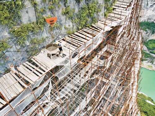 工程實(shí)施:在懸崖上由專門施工人員搭設(shè)滿了