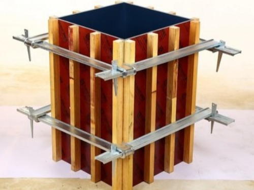 方柱扣加固件和傳統(tǒng)的模板加固方式相比,新型方柱扣加固件結(jié)構(gòu)簡(jiǎn)單,操作方便,新型方柱扣加固件所需的材料由單片折彎式可調(diào)加固件、緊固斜鐵、輔助支架組成,模塊化構(gòu)件組合施工簡(jiǎn)便快捷,效率高。該新型加固方式模板無(wú)須打孔,具有足夠的強(qiáng)度和鋼度,脫模后混凝土觀感質(zhì)量好,由于模板無(wú)須打孔,從而增加了木模板的周轉(zhuǎn)次數(shù)。