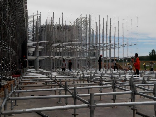 盤扣腳手架系統(tǒng)作為模板支架搭設(shè)時應(yīng)根據(jù)施工方案計算得出立桿的排架尺寸并選用定長的水平桿,根據(jù)支撐高度組合插套的立桿段、可調(diào)托座和可調(diào)底座。施工時按照流程進行搭設(shè),避免給后續(xù)的施工工作造成不必要的麻煩。